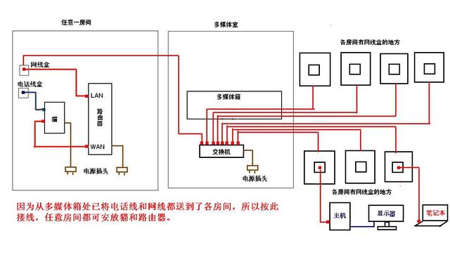 其實,這都是電工沒有進行詳細的規(guī)劃,比如,舉一個最常見的例子:路由器在電視墻附近,弱電箱或者多媒體箱擺放在入門的玄關(guān)處,此時,一定要從路由器再拉一根網(wǎng)線到回到弱電箱或者多媒體箱就可以了。